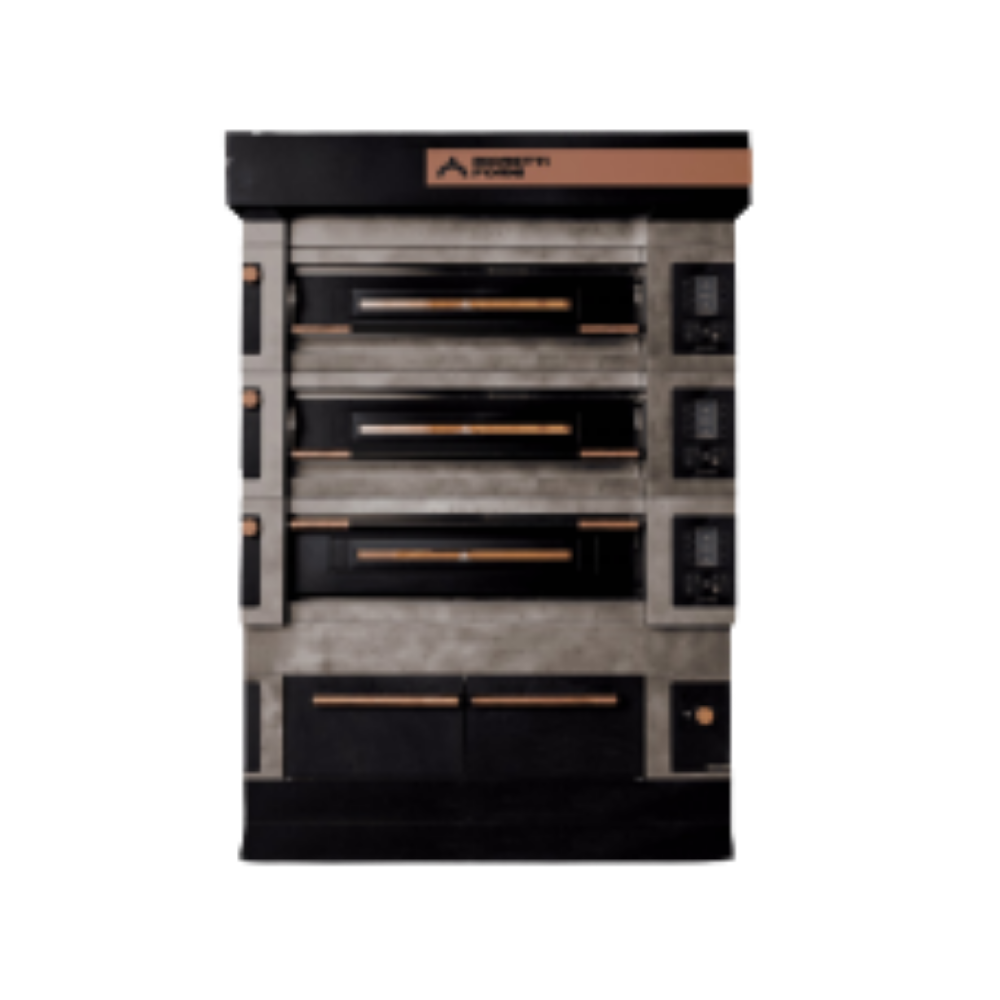 Moretti Forni S125ES-161616-P, yüksek kapasiteli üretim için özel olarak tasarlanmış üç katlı profesyonel bir elektrikli taş tabanlı fırındır. Her katta 16 cm iç yükseklik sunar ve bu sayede farklı ürün gruplarının aynı anda homojen şekilde pişirilmesini sağlar. Özellikle ekmek, pizza, börek, çörek ve pastacılık ürünlerinde üstün sonuçlar elde edilir.
